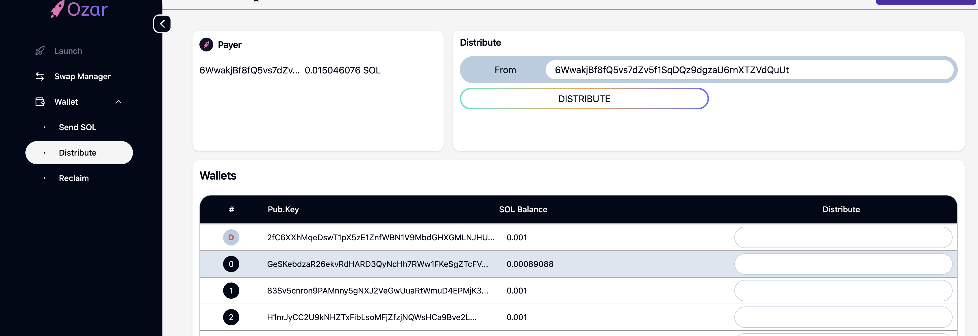 1\.  Select **Distribute SOL** from the **Wallet** menu. The distribution screen will appear.